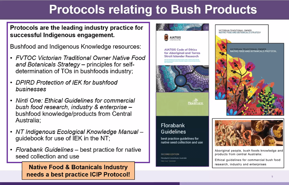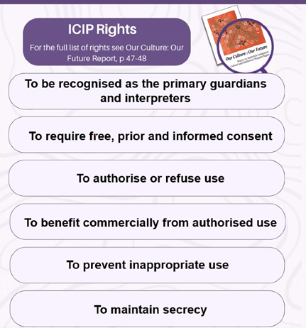 The United Nations Declaration on the Rights of Indigenous Peoples (UNDRIP) is an international legal instrument that Australia is a signatory to. The presentation suggested that the following three articles are especially relevant in respect to ICIP and to the native food and botanicals sector in particular: