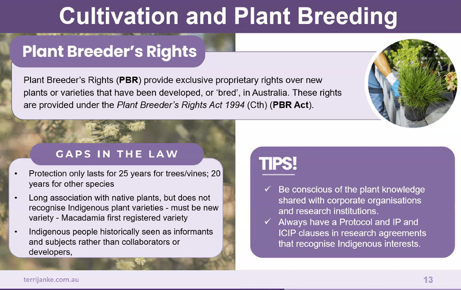 Earlier in 2024, I was pleased to be among the attendees present during an online webinar hosted by Terri Janke and Company, and presented by Anika Valenti, a Senior Associate in the firm. The webinar was relevant to Indigenous producers working in the bushfoods industry, to provide them some background and knowledge about the laws and regulations that apply to that industry. The session provided a high-level discussion about the legal considerations that bush food producers and related enterprises need to know when they develop their business venture. The webinar also offered important tips for Indigenous producers to protect their Indigenous Cultural Intellectual Property (ICIP) and their IP more broadly. All images contained in this blog post are from the presentation slides shown during the “Law Way: From Bush to Business” webinar, and are the work of Terri Janke and Company Pty Ltd.