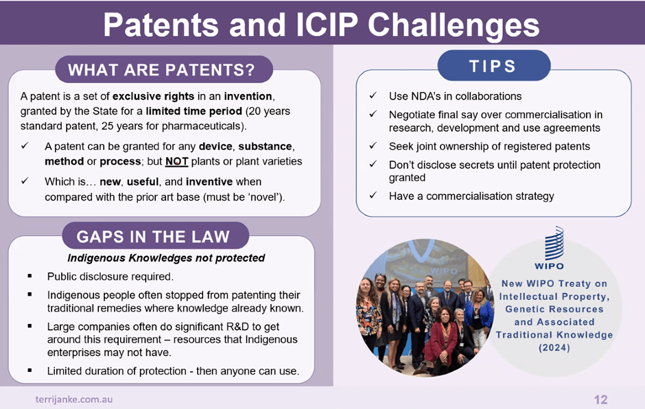 In light of this current inadequacy in the protection of Indigenous cultural heritage, the webinar outlined the use of patent registrations and how they can be applied. While a plant or a seed, (thankfully) cannot be registered under a patent, what can be registered are capabilities of those resources insofar as what can be extracted from them and then used for other products e.g. in the previously-mentioned Mary Kay example, Kakadu Plum and the property or capability that can be extracted from it (Vitamin C), and then used in one of their cosmetic products. What can also be registered under a patent is a process (this might be a harvesting, extraction, preparation or other novel process), a particular attribute of the resource (the enzyme for example) and an application that has a particular quality (e.g. – numbing quality derived from a particular application etc.).