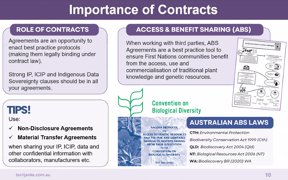 In the meantime, as can also be seen in the above image, what can be applied by Indigenous communities and enterprises is contractual in nature, for example the use of non-disclosure agreements (NDAs) or commercial agreements that outline use of Indigenous knowledge and how the relevant community will be honoured and, ideally, provided final say within those agreements. The advice for participants was “Don’t pass on knowledge to anyone until you have an NDA in place. This can protect you until formal agreements are in place.” And in the instances where commercial organisations or university and other research institutions are involved, Access and Benefit Sharing (ABS) agreements will protect your community while testing and resource collection is occurring to determine what will happen to materials and the knowledge and findings etc that result from the use.