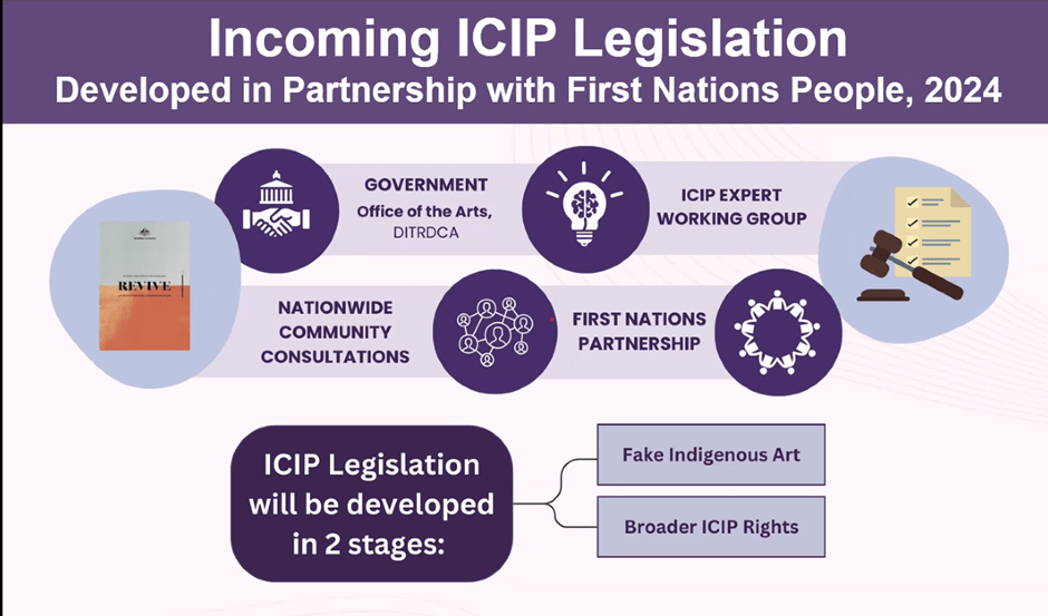 Indigenous Cultural Intellectual Property (ICIP) is a branch of Intellectual Property law that gives legal protection to some of the things that are produced as a result of the intellectual efforts of Indigenous Australians.3 It covers tangible and intangible aspects of Aboriginal and Torres Strait Islander Peoples’ cultural heritage. Terri Janke, (namesake of the company who hosted the webinar) who is an international authority on Indigenous Cultural and Intellectual Property (ICIP) states that intellectual property law “gives people – creators – rights to property of their mind.”